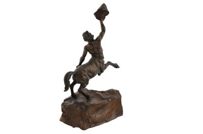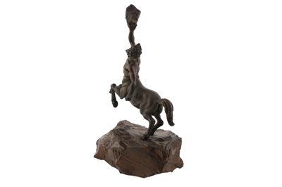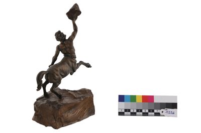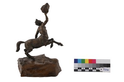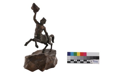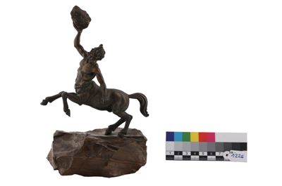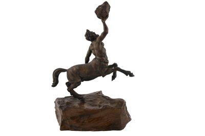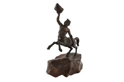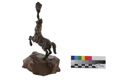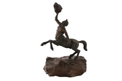Statuetta in bronzo con base in selce raffigurante un centauro impennato che regge un meteorite.