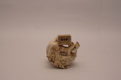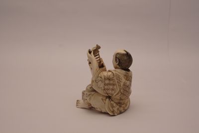 Statuetta, okimono (letteralmente: oggetto da posare), in avorio, raffigurante un uomo seduto a terra che, prendendo una scatola, scopre che questa era stata trasformata in tana da due topi, che cercano una via di fuga proprio addosso all'uomo. Alcuni dettagli, come le decorazioni della veste o i capelli, sono dipinti di nero. L'uomo, che porta la fronte rasata, l'acconciatura tradizionale degli adulti, indossa un giacchetto decorato a motivi geometrici e a fiori.