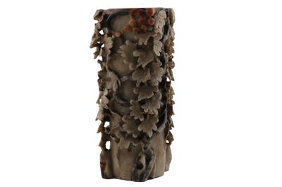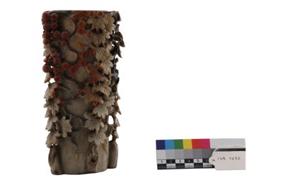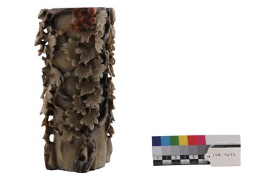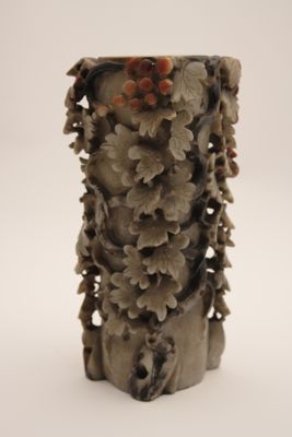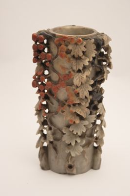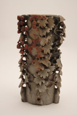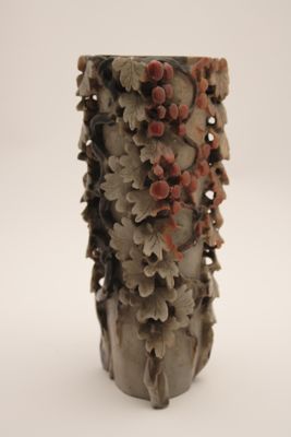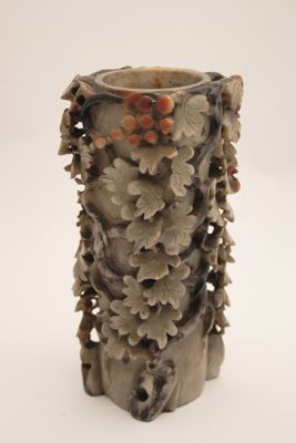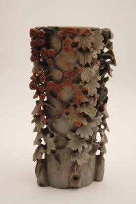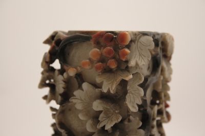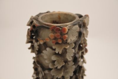 In questo caso, l'artigiano ha sapientemente giocato con i colori naturali della pietra creando un oggetto decorativo d'effetto. L'uso di intagliare piccoli oggetti raffinati nella pietra è esistito per secoli in Cina, ma in periodo Qing, in particolare a partire dal 1700, statuette di divinità o di fanciulle e vasetti estremamente elaborati come questo ebbero grande popolarità.