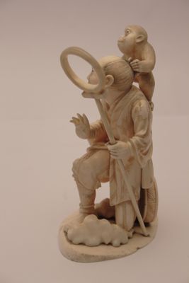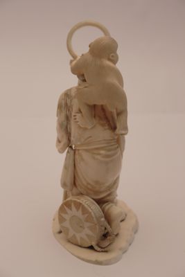 Statuetta, okimono (letteralmente: oggetto da posare), in avorio, raffigurante un ammaestratore di scimmie (sarumawashi) con la scimmia sulle spalle. L'uomo è a piedi nudi, porta i capelli rasati frontalmente, indossa una veste tradizionale con giacchetta a lunghe maniche, pantaloni e copri stinchi. Incede quasi acquattato, con un bastone, nella mano sinistra, alla cui estremità è attaccato un cerchio. Ai suoi piedi un tamburo e altri oggetti utili usati per lo spettacolo ambulante. Alcuni particolari come occhi, sopracciglia e capelli sono dipinti di nero. Il fondo del piedistallo è inciso con il motivo di tre fiori.