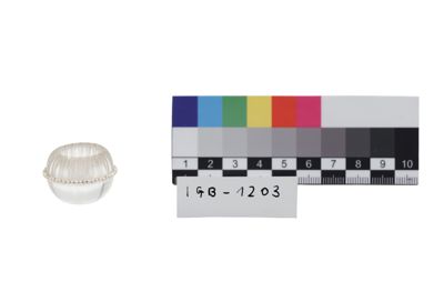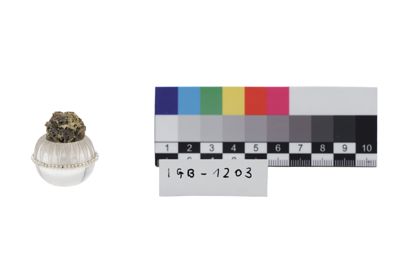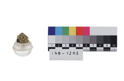Coppetta in quarzo bianco con filo di perle sul diametro massimo. Minerale di oro nativo (cm. 2,5*2)