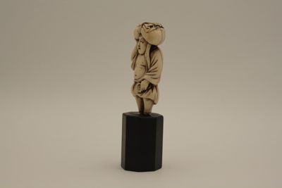 Netsuke, fermaglio per cintura, in avorio scolpito a tuttotondo e patinato raffigurante un uomo con la veste che lascia il ventre scoperto, con i sandali di paglia in mano, i pantaloni alzati alle ginocchia e un sacco tenuto sulla testa sopra il quale si trova un ventaglio. I due fori (himotoshi) sono stati praticati sulla schiena. Alcuni dettagli incisi, come le sopracciglia sono colorati di nero. I piedi sono stati tagliati per attaccare il netsuke ad una base in legno.