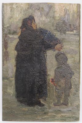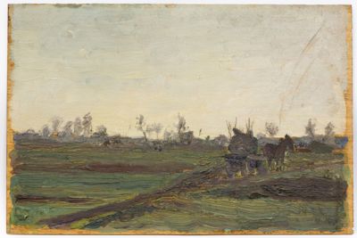 Dipinto a olio di piccole dimensioni di Aldo Carpi, raffigurante una veduta con una fabbrica, montato in ua cornice originale con altri due dipinti dell'autore.