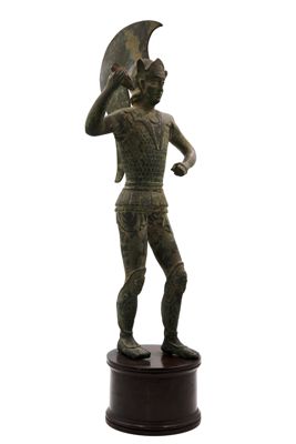 La scultura in bronzo, patinato a simulare un'ossidazione, richiama quella analoga del guerriero del Museo Archeologico Nazionale di Firenze (Richardson, Warrior III 5 Series B Group 2), di cui sembra una copia.