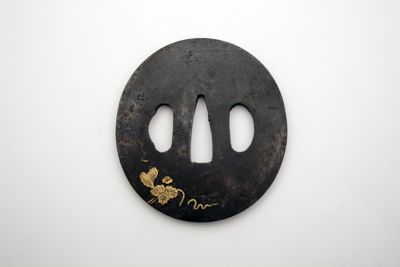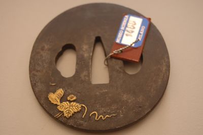 Elsa di spada giapponese di forma rotonda (marugata) e bordo tondo (marumimi), con i tre fori canonici, quello centrale (nakagoana) per il codolo, il foro di sinistra (kozuka hitsuana) per il coltellino, e quello di destra (kogai hitsuana) per lo spillone. Rappresenta farfalle, foglie e un ventaglio.