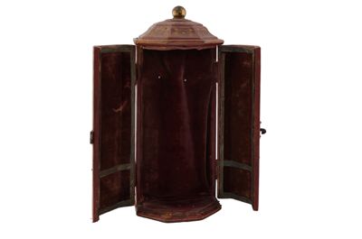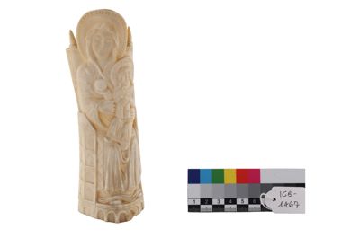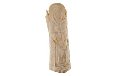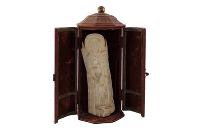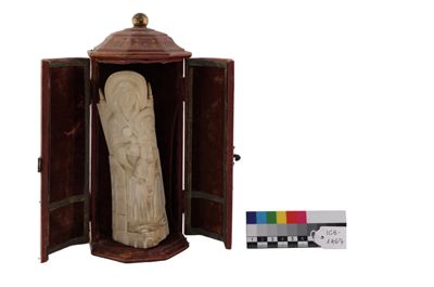 Il manufatto si presenta come una placca in avorio in stile medioevale raffigurante una Madonna con il bambino. L'opera è conservata in una custodia in cuoio rosso con decori dorati, a base esagonale, apribile tramite due piccole ante, e con l'interno foderato in velluto color porpora.