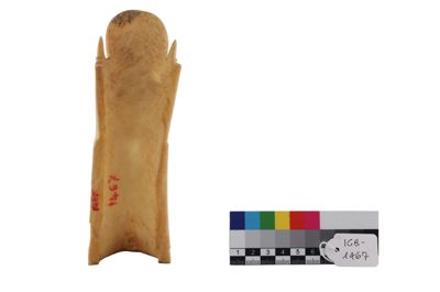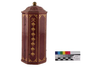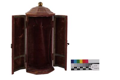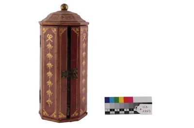 altezza: 16,7 cm (scultura); larghezza: 5,3 cm (scultura); altezza: 23,4 cm (astuccio); diametro: 9,5 cm (astuccio)
