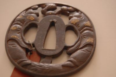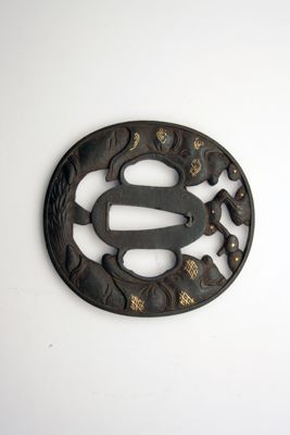 Elsa di spada giapponese di forma ovale, con i tre fori canonici, quello centrale (nakagoana) per il codolo, il foro di sinistra (kozuka hitsuana) per il coltellino, e quello di destra (kogai hitsuana) per lo spillone. Rappresenta i due sennin, o immortali taoisti, Jittoku e Kanzan, uno con in mano una scopa e l'altro un rotolo.