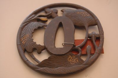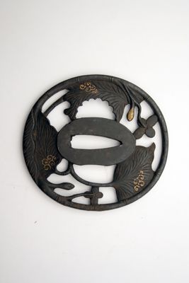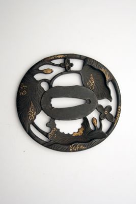 Elsa di spada giapponese di forma tonda, con bordo a forma di bastone di bambù, con i tre fori canonici, quello centrale (nakagoana) per il codolo, il foro di sinistra (kozuka hitsuana) per il coltellino, e quello di destra (kogai hitsuana) per lo spillone. Rappresenta tre foglie di aoi, e fiori di ciliegio. Il bordo è a forma di stelo di bambù, mentre il kogai hitsuana è a forma di foglia mangiata dagli insetti.