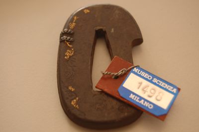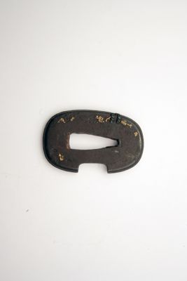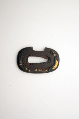 Elsa di spada giapponese per coltello (tanto), a forma ovale, con una rientranza laterale per il coltellino. E' rappresentato un paesaggio con alberi di pino. Per l'intarsio in oro ed in argento sono usate due tecniche diverse: la tecnica suemon zogan, in cui la decorazione appare in rilievo, e la tecnica nunome, o ageminatura, anche chiamata falsa incisione.