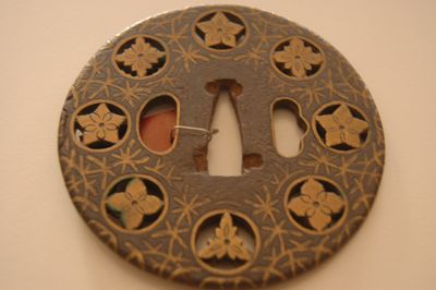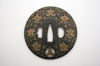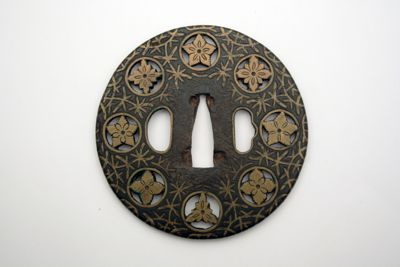 Elsa di spada tonda, con i tre fori canonici, quello centrale (nakagoana) per il codolo, il foro di sinistra (kozuka hitsuana) per il coltellino, e quello di destra (kogai hitsuana) per lo spillone.