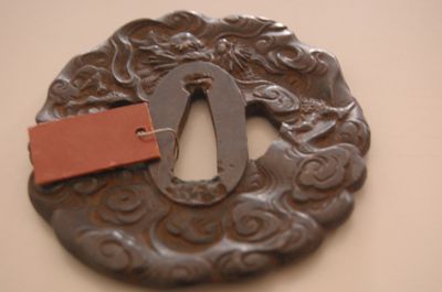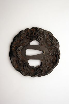 Elsa di spada giapponese di forma tonda, con i tre fori canonici, quello centrale (nakagoana) per il codolo, il foro di sinistra (kozuka hitsuana) per il coltellino, e quello di destra (kogai hitsuana) per lo spillone. Decoro inciso a bassorilievo raffigurante un drago.