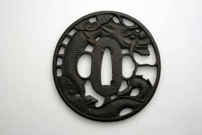 Elsa di spada giapponese di forma tonda, con decorazione traforata (sukashi), con i tre fori canonici, quello centrale (nakagoana) per il codolo, il foro di sinistra (kozuka hitsuana) per il coltellino, e quello di destra (kogai hitsuana) per lo spillone. E' rappresentato un drago. Gli occhi dell'animale mitico sono intarsiati in ottone.