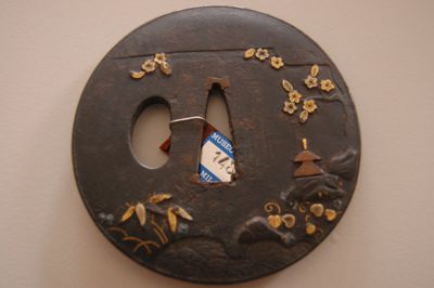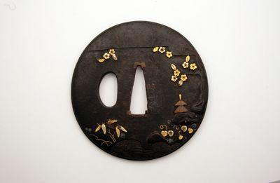 Elsa di spada giapponese di forma tondaSono presenti il foro centrale (nakagoana) per il codolo della lama e il foro di sinistra (kozuka hitsuana). Rappresenta un paesaggio primaverile con una pagoda sotto un albero di ciliegio e foglie e fiori realizzati a intarsio d'oro e ottone.