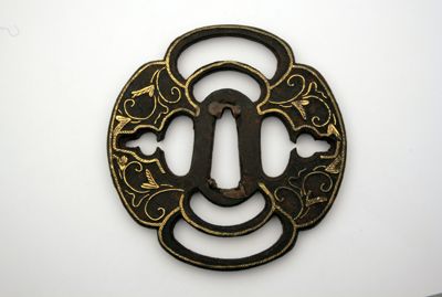 Elsa di spada giapponese di forma quadrilobata (mokkogata), con i tre fori canonici, quello centrale (nakagoana) per il codolo, il foro di sinistra (kozuka hitsuana) per il coltellino, e quello di destra (kogai hitsuana) per lo spillone. Motivo floreale realizzato con tecnica a corda (nawame).