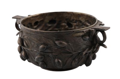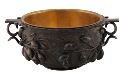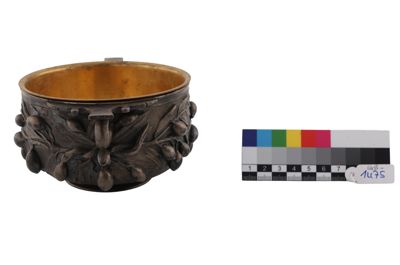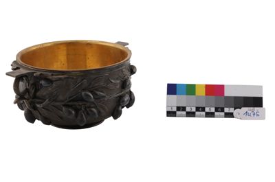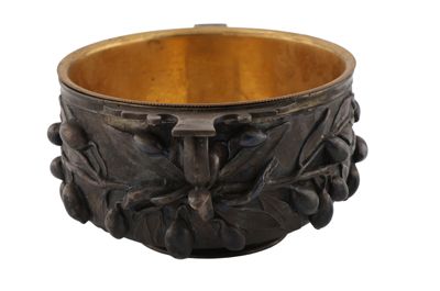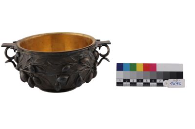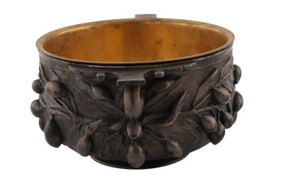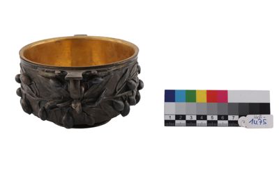 Il manufatto si presenta come un portacenere in argento costituito da due parti: il contenitore vero e proprio è in argento e caratterizzato da decorazioni vegetali a rilievo, in questo caso foglie e frutti di ulivo, mentre la ciotola che si inserisce dentro il contenitore è in argento dorato e priva di decorazione.
