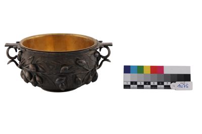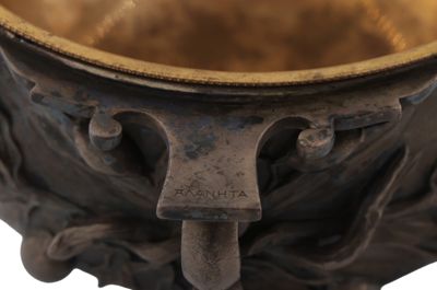 L'iscrizione sul manico "ΠΛANHTA" permette di attribuire il manufatto alle Argenterie Planeta di Napoli, attive nella prima metà del Novecento. Francesco Mauro e la moglie aquistarano molti argenti in stile antichizzante da questo argentiere, citato più volte nell'elenco topografico della loro collezione, contestuale alla donazione al Museo.