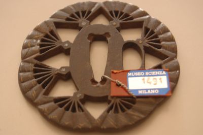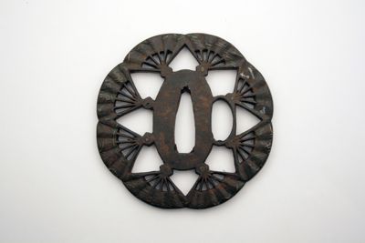 Elsa di spada a forma ottagonale. Sono presenti il foro centrale per il codolo (nakagoana) e il foro di sinistra (kozuka hitsuana). Traforo a giorno a motivo di otto ventagli.