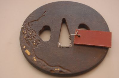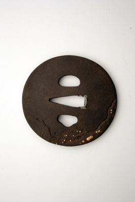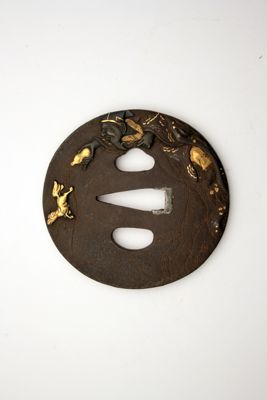 Elsa di spada giapponese di forma tonda, con i tre fori canonici, quello centrale (nakagoana) per il codolo, il foro di sinistra (kozuka hitsuana) per il coltellino, e quello di destra (kogai hitsuana) per lo spillone. Rappresenta Chokaro (Zhang Guolao), uno degli otto immortali taoisti, che convoca il suo cavallo attraverso una zucca.