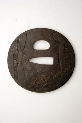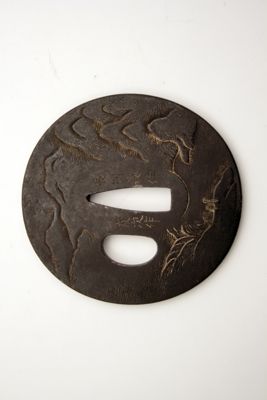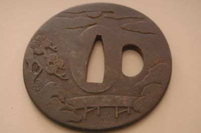 Elsa di spada giapponese di forma ovale. Sono presenti due fori: quello centrale (nakagoana) per il codolo e il foro di sinistra (kozuka hitsuana). Sul fronte è visibile un ponte con a fianco un pruno. Sul verso sono raffigurate due figure che osservano le montagne dalla riva di un fiume.