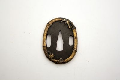Elsa di spada giapponese di forma ovale, di piccole dimensioni, per spada corta, con bordo ripiegato sulla superficie che assume la forma di stelo di bambù. Presenta i tre fori canonici, quello centrale (nakagoana) per il codolo, il foro di sinistra (kozuka hitsuana) per il coltellino, e quello di destra (kogai hitsuana) per lo spillone. La decorazione, realizzata con un intarsio in oro e shakudo, rappresenta delle foglie, un fiore e una melanzana.