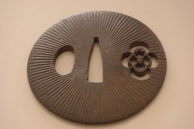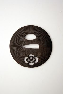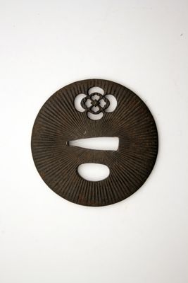 Elsa di spada giapponese di forma tonda. Sono presenti il foro centrale per il codolo (nakagoana) e il foro di sinistra (kozuka hitsuana). Rappresenta uno stemma gentilizio a tutto tondo. Sulla superficie sono visibili delle linee incise che partono dal centro dell'elsa, chiamate (yasurime).