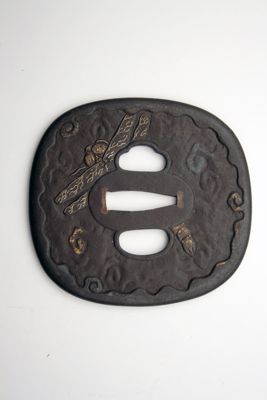 Elsa di spada giapponese di forma ovale con bordo ripiegato, con i tre fori canonici, quello centrale (nakagoana) per il codolo, il foro di sinistra (kozuka hitsuana) per il coltellino, e quello di destra (kogai hitsuana) per lo spillone. Rappresenta in rilievo una farfalla. Sul verso è raffigurata una libellula. La decorazione centrale, su tutti e due i lati, è stata realizzata in agemina d'ottone e oro (nunome zogan).