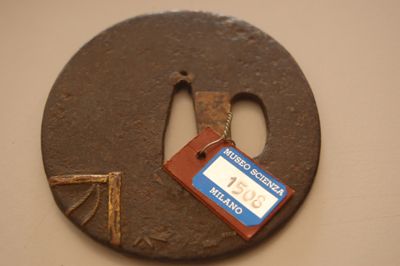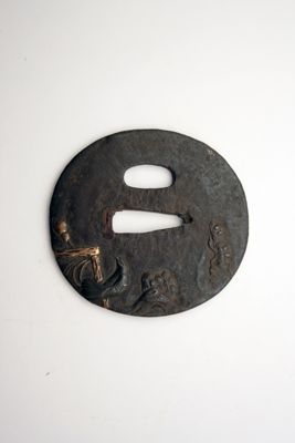 Elsa di spada giapponese di forma ovale (nagamaru). Sono presenti il foro centrale per il codolo (nakagoana) e il foro di sinistra (kozuka hitsuana). E' rappresentato un falco sotto un pino.