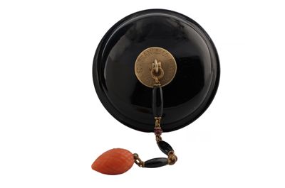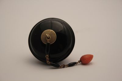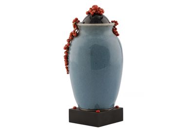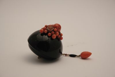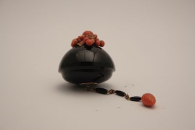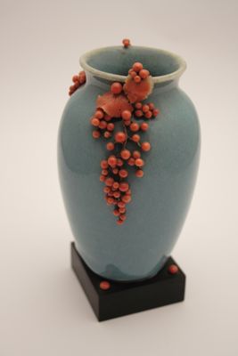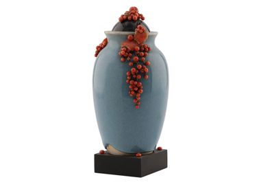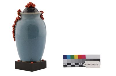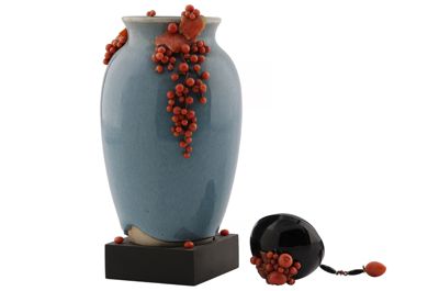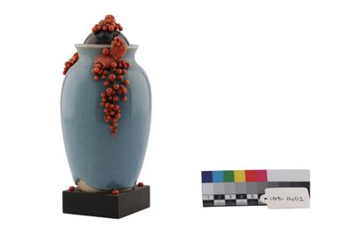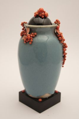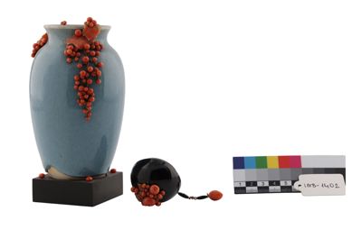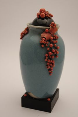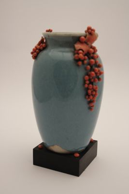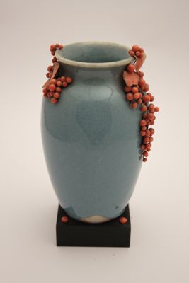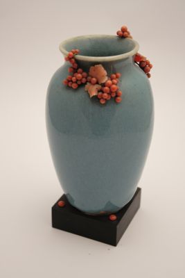 Vasetto in ceramica invetriata a corpo ovoidale, base piatta e spalla alta, collo brevissimo terminante a labbro everso. La vetrina è di tipo jun, azzurra, spessa e densa. Al vasetto sono state applicate guarnizioni in corallo a motivo d'uva. Il vasetto è stato montato su una base quadrata a zoccolo di legno con intaglio circolare per accogliere il piede e con un coperchietto (tappo) in calcedonio lavorato a cabochon con pomolo in corallo. Un pendaglio mobile formato da tre segmenti di calcedonio uniti da giunti in bronzo dorato e terminante con un elemento fitomorfo a forma di frutto in corallo, pende dal centro del coperchio.