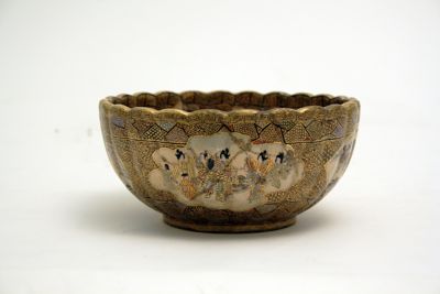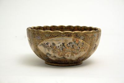 Le produzioni ceramiche della provincia di Satsuma, nell'attuale prefettura di Kagoshima, si caratterizzano per il grès giallo paglierino finemente incrinato. In periodo Meiji, dopo il 1875, le fornaci di Kagoshima iniziarono una produzione su scala industriale per il mercato estero. Erano gli oggetti più carichi di dorature e ricchi di decoro ad affascinare gli acqurenti occidentali. Tra la fine del XIX e l'inizio dee XX secolo le superfici divennero particolarmente affollate di personaggi come nel caso di questa coppa.