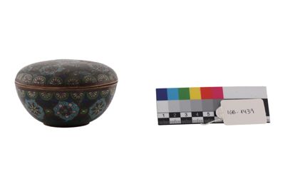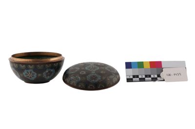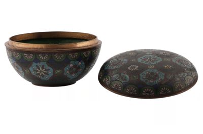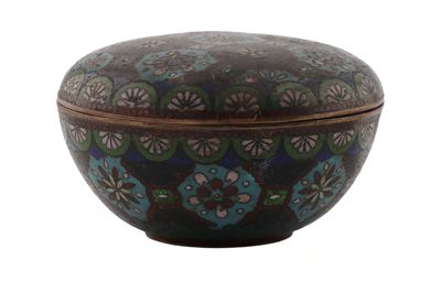 Piccolo contenitore con coperchio (due pezzi) in metallo cloisonnè verde e blu con disegni floreali.