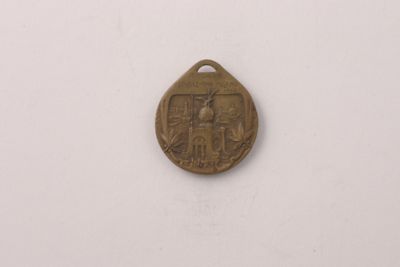 Medaglia mistilinea pubblicitaria in ottone, commemorante l'Esposizione internazionale di Milano del 1906 e il padiglione della distilleria Fernet Branca. Sul recto raffigura il logo della Fernet Branca, sul verso una veduta del padiglione aziendale all'interno dell'Esposizione.