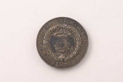 Medaglia in bronzo argentato commemorante la Prima Esposizione Internazionale Operaia nel contesto delle Esposizioni Riunite di Milano del 1894. Sul recto presenta un globo terrestre, con stella raggiante sulla città di Milano, con quattro putti nudi, volanti, reggenti una corona d'alloro, squadra e compasso, savadanaio e libro. Sul verso presenta una corona d'alloro legata da nastri con iscrizioni e lo stemma coronato del comune di Milano.