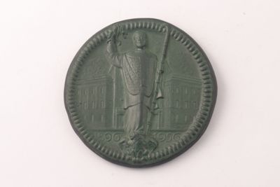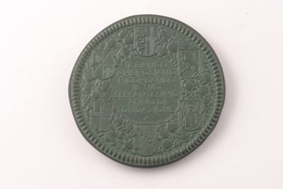 Medagli in bronzo commemorante il sessantesimo anniversario della fondazione del Banco Ambrosiano di Milano. Sul recto presenta Sant'Ambrogio stante su aquila con flagello e bastone pastorale; sullo sfondo il palazzo sede della banca. Sul verso presenta un festone circolare di foglie e frutti di melograno recante un gruppo di sei stemmi.