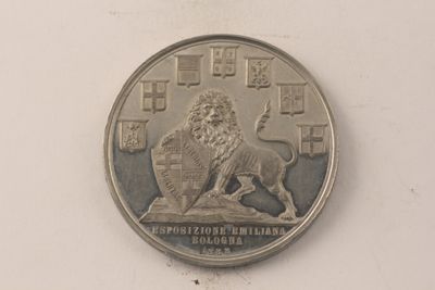 Medaglia realizzata in occasione della Esposizione emiliana di Bologna tenutasi dal 07 maggio all'11 novembre nei giardini Margherita di Bologna. L'inaugurazione dell'evento ebbe una grande eco e impatto sulla città e vide la presenza del re Umberto I, della regina Margherita e del principe di Napoli Vittorio Emanuele. L'esposizione riguardò sia l'Industria che l'Agricoltura e l'Arte.