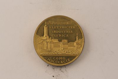 Medaglia coniata dall'Istituto Stefano Johnson di Milano in occasione dell'Esposizione internazionale di Como di elettricità e industria serica, tenutasi a Como dal maggio al novembre 1899. L'Esposizione coincise con il centenario dell'invenzione della pila elettrica ad opera di Alessandro Volta (1745-1827) a cui la città di Como aveva dato i natali.
