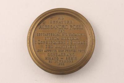 Medaglia realizzata dallo Stabilimento Stefano Johnson, fabbrica privata di medaglie, distintivi e appliques fondata nel 1836 a Milano. La medaglia venne commissionata nel 1889 allo Stabilimento Johnson dal Lanificio Rossi, di cui il Sen. Rossi era proprietario, in occasione del suo 70° genetliaco. Il modello della medaglia fu opera del pittore e scultore Lodovico Pogliaghi (1857-1950), mentre la sua incisione fu opera di Angelo Cappuccio (1855-1918), incisore milanese attivo presso lo Stabilimento Stefano Johnson tra le fine del XIX secolo ed i primi del XX.