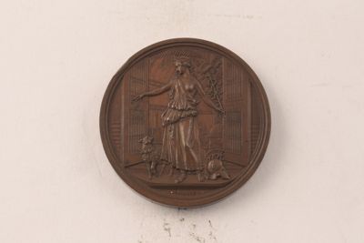 Medaglia coniata dalla ditta di fabbricazione medaglie John Pinches Medallist in occasione della inaugurazione del Crystal Palace di Londra trasferito dalla sua sede temporanea in Hyde Hill a quella permanente in Sydenham Hill nel giugno 1854, dove resterà fino alla sua distruzione a causa di un incendio nel 1936. L'allegoria al recto sottolinea il rapporto tra scienza e industria che aveva dato il via alla Rivoluzione industriale, qui celebrata come il progresso dell'umanità. La figura femminile allegorica viene rappresentata nell'atto di schiudere le porte dell'Industria e della Scienza che celano il progresso tecnico industriale. Il caduceo alato e il cimiero con civetta, attributo di Minerva medica, sono un probabile richiamo al progresso anche in campo medico, schiuso anch'esso dalla Rivoluzione industriale.