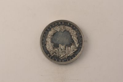 Medaglia premio realizzata per l'Esposizione nazionale italiana di Milano, tenutasi dal 06 maggio al 01 novembre 1881 a Milano, nell'area di Porta Venezia. L'Esposizione riguardò sia l'Industria che l'Agricoltura e l'Arte, come ben esemplifica la raffigurazione allegorica al verso della medaglia che riprende i simboli di ognuno di questi ambiti. La presente medaglia, come illustra la Rivista dedicata all'Esposizione "Milano. L'esposizione italiana", era la medaglia premio dell'evento, coniata dalla Zecca di Milano (rimasta in attività fino al 1892) in una versione in oro, argento e bronzo (cfr. Milano e l'Esposizione italiana, 1881, p.294). Il nome della ditta o del soggetto vincitore veniva inciso al rovescio, entro la ricca ghirlanda. Il presente esemplare, privo di incisioni al verso rappresenta quindi un pezzo di prova o non assegnato.
