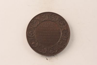 Medaglia coniata dall'Istituto Stefano Johnson di Milano per celebrare le Esposizioni Riunite che si tennero fra il 06 maggio e il 06 novembre 1894 nell'area del Castello Sforzesco di Milano. La medaglia rappresenta al verso dieci distinti medaglioni che richiamano simbolicamente le arti protagoniste dell'esposizione restituendo un'immagine anche visiva della grade ricchezza e varietà dei temi espositivi. Tra quest'ultimi figurarono accanto alle Arti applicate, la Scultura e la Pittura anche arti più giovani quali la Fotografia e la Filatelia. In totale l'Esposizione riuniva 11 ambiti differenti. Nell'ordine delle simbologie riportate sulla medaglia sono visibili in senso orario: Sport, Belle Arti, Fotografia, mostra Operaia, Teatro, Filatelia, Geografia, Vini e olii, e Arti grafiche e pubblicitarie.