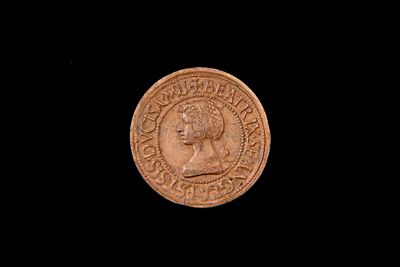 Medaglia in bronzo commemorante la mostra su Leonardo da Vinci che ebbe luogo a Milano nel 1939. Sul recto presenta l'effige di profilo di Beatrice d'Este. Sul verso presenta, fra due nastrini anguiformi, un pendente a forma di punta di freccia recante iscrizioni.