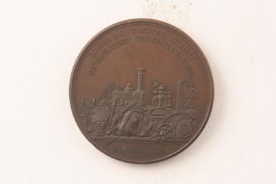Medaglia coniata in occasione dell'Esposizione universale di Parigi del 1867 per celebrare la partecipazione delle industrie e imprese italiane all'evento. La complessa composizione simbolica raffigurata al verso esemplifica il ruolo delle industrie italiane, simboleggiato dalla macchina a vapore dell'industria Galileo e dalla ciminiera. Allo stesso modo la medaglia rappresenta tuttavia anche le arti italiane che, al pari delle industrie, trovavano espressione nell'Esposizione, simboleggiate dal capitello, dal compasso e dalla tavolozza da pittore e il commercio italiano, rappresentato dall'albero della nave a vela che svetta sulla destra della composizione. Industria e manifatture italiane portano anche abbondanza e ricchezza, simboleggiate dalle spighe e covoni di grano e dai frutti.