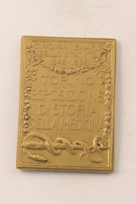 Targa coniata dall'Istituto Stefano Johnson di Milano in occasione dell'Esposizione generale italiana tenutasi da aprile ad ottobre 1898 a Torino e fatta coincidere con il 50° anniv. dello Statuto Albertino, la Carta costituzionale del Regno di Sardegna, concessa da re Carlo Alberto di Savoia nel 1848. La targa proviene dalla mostra di Storia della medicina, interna alla Esposizione che raccoglieva erbari, manoscritti gride e cimeli della Storia della Medicina (cfr. 1898. L'esposizione nazionale, 1898, p. 118)