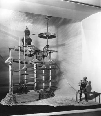 Nel diorama è anche collocata la riproduzione di un uomo al tavolo da lavoro.