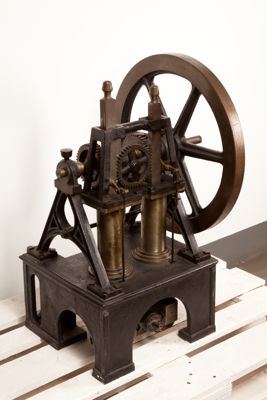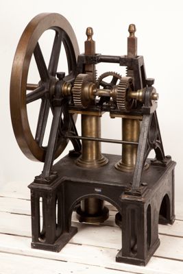 Il dispositivo è montato su una massiccia struttura che fa da base; in questa sono fissati i due cilindri e da questa partono due montanti che sostengono l'asse con le due ruote dentate e il volano. I cavallotti dei montanti, superiormente, presentano due vasi metallici con funzione di oliatori.