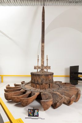 Il mozzo della ruota, sulla superficie laterale e in corrispondenza degli incastri delle pale, presenta una numerazione recente, da 1 a 18, a vernice nera; una medesima numerazione è presente sulle pale, sia a vernice (in numeri arabi) che a intaglio (in numeri romani).