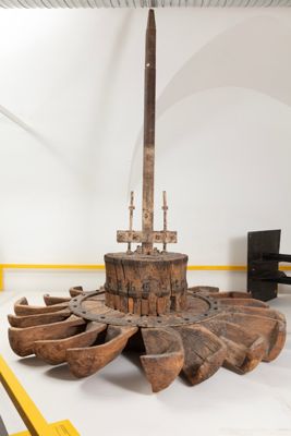 Si tratta di uno dei pochi tipi di ruota idraulica ad asse verticale ed è interessante notare che le sue pale, scavate nel legno a forma di mezzo cucchiaio, compaiono in un disegno del Codice Atlantico di Leonardo (304 v) che mostra una girante di questo tipo ed il modo di sagomarle. Diversi altri autori, fra cui Ramelli (1588), B. Belidor (1737) e Meissner (1880) illustrano tale tipo di ruota con varietà di rappresentazioni.