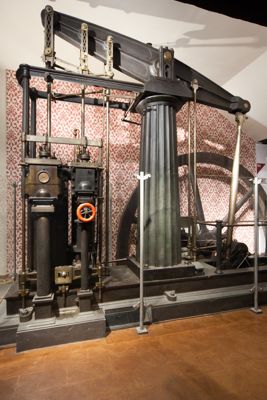 Questa macchina a vapore di Horn è costituita da una parte termica, organi di trasmissione e un grande volano.
