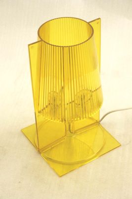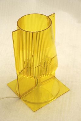 Lampada da comodino trasparente di colore giallo (codice colore Q6). La forma nasce dalla congiunzione di due parti speculari: due lastre piatte e rettangolari che da bidimensionali al centro assumono la forma e il volume della "semi-lampada". La plissettatura all'interno del diffusore crea, quando la lampada è accesa, un gioco di riflessi.
