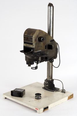 Nella parte inferiore di questo dispositivo sono inseriti due portaobiettivi ciascuno con un telaio circolare (che probabilmente conteneva un filtro rosso) posizionabile a piacere davanti agli obiettivi. Un porta obiettivo è vuoto, l'altro contiene un obiettivo Schneider Componar azzurrato 1:4,5 f=105cm con diaframma a iride ed aperture da f/4,5 a f/22 regolabili direttamente ruotando una ghiera sull'obiettivo stesso. Lo stesso obiettivo poteva essere inserito indifferentemente in ciascun portaobiettivo. Inserito in quello con f=50mm è da utilizzare per negativi 24x36mm e permette ingrandimenti da 2,3 a 16 volte, inserito in quello con focale f=105mm è da utilizzare con negativi 7x9cm e permette ingrandimenti da 1,4 a 7 volte.